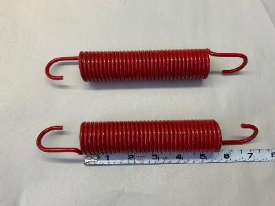 1970 Dodge Challenger T/A AAR Cuda Hood Hinge Springs. These reproduction steel spring coils are around 5-3/8 inches long coil to coil and 1-5/16 inch in diameter—correct size and tension for original T/A and AAR fiberglass hoods. The tension may not be proper for aftermarket hoods, which may be heavier than the original hoods. The last photo is for reference and shows an original spring installed. We also sell longer springs that provide the same tension and are 1-3/4 inch longer—Reference Chrysler part number 3586214.