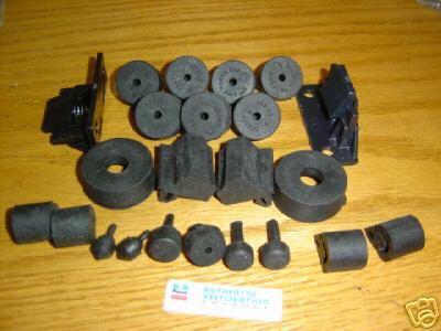 Mopar Authentic Restoration body bumper kit for 70 Cuda and Barracuda. Includes the hood bumpers (between the hood wedges in the picture), 3 bumpers for the rear of hood, 2 side rubber and 2 spring loaded plastic side wedges, which mount in the fenders and the 2 front bumpers which have the Chrysler part number (2276804). The bumpers in the back three rows are for the ashtray, glove box door, trunk and doors. Some have the pentastar. Includes all the parts in the photo.