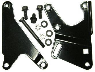 69-76 Mopar B E Body Cuda 383 440 Saginaw Power Steering Pump Bracket for cars without a/c. Fits both styles of Saginaw pumps. Includes the correct OE style fasteners to mount the pump to the brackets and the assembly to the water pump housing. Extra washer provided for use on water pump housing bolt in adjusting slot. Powder coated black.